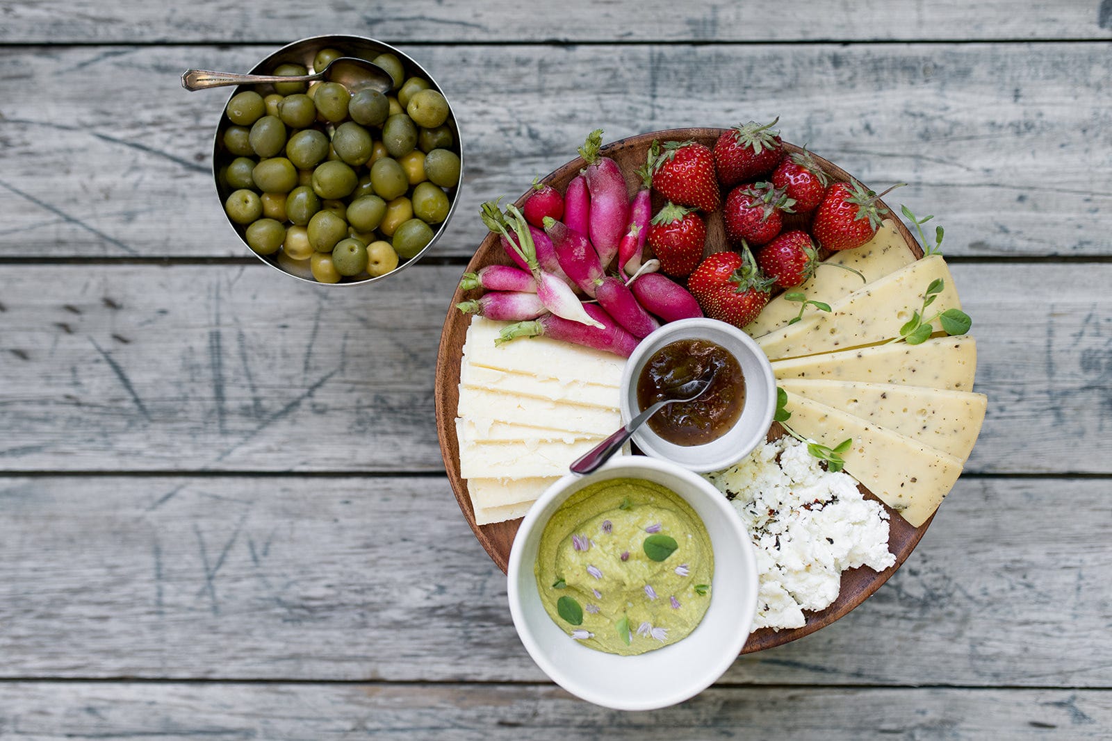 snack plate with grilled bread, seedy crackers, local cheeses, sweet pea dip, breakfast radishes + juicy strawberries