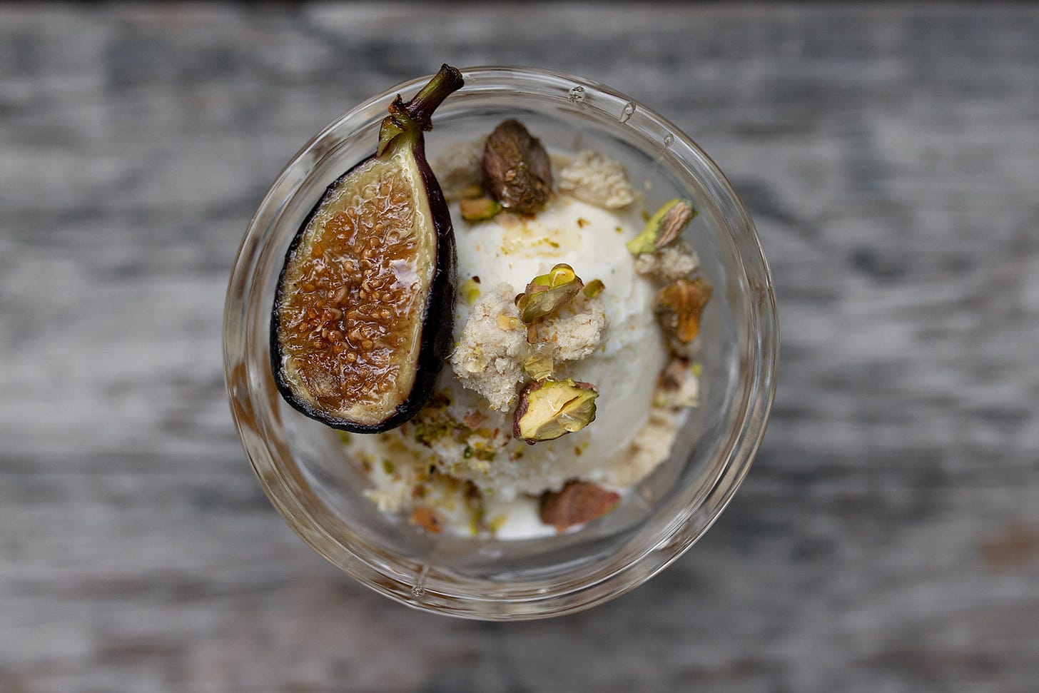 seared fig sundaes topped with toasted pistachios, halva + hot honey